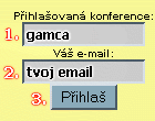 Na pandore máme spravenú konferenciu (mailing list). Adresa je gamca@pandora.cz. Ak sa chceš prihlásiť, tak musíš vyplniť formulár, ktorý je na úvodnej stránke. Názov konferencie je gamca (1.), do okienka váš e-mail (2.) napíš e-mailovú adresu na ktorú chceš dostávať e-maily z konferencie a z ktorej budeš posielať príspevky do konferencie. Potom stlač tlačítko Přihlaš (3.). Za nejaký čas by ti mal dojsť e-mail z pandory, ktorý musíš poslať naspať, aby na pandore vedeli, že ťa do konferencie niekto neprihlásil bez tvojho vedomia. Po nejakom čase (vačšinou behom dňa, keď si sa prihlásil(a)) by ti mal dojsť e-mail o prijatí do konferencie. Od teraz ti budú chodiť e-maily z našej konferencie. V prípade, že pošleš e-mail do konferencie a príde ti z pandory e-mail, v ktorom sa píše, že nie si členom konferencie, tak sa musíš buď prihlásiť znova, alebo chvíľu ešte počkať na prijatie do konferencie.
